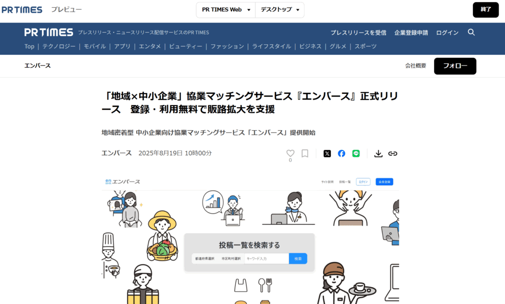 「地域×中小企業」協業マッチングサービス『エンバース』正式リリース 登録・利用無料で販路拡大を支援