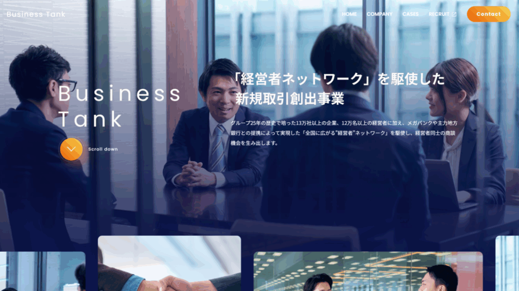 Business Tank は、「経営者ネットワーク」を活用して、「新規取引創出」(販売先・仕入先・業務提携など)を支援する B2B マッチング/商談創出サービスです。会員企業の経営者ネットワークをもとに、企業の成長(売上増・利益増・コスト削減など)に寄与する商談機会を提供するのが主な役割です。
