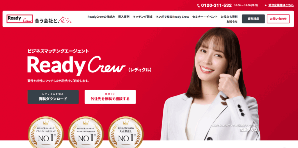 Ready Crew(レディクル)は、フロンティア株式会社が運営する完全無料のビジネスマッチングサービスです。主にBtoB企業向けに、要件や相性にマッチした外注先を紹介し、商談までをサポートします。