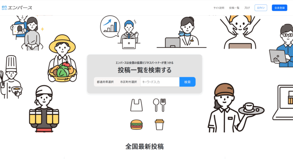 「エンバース」は「全国の協業ビジネスパートナーが見つかる」プラットフォーム。地域を絞って(都道府県・市区町村・キーワード等で) 協業先や提携先を探したり、自社のサービス・商品をアピールしたりできる。