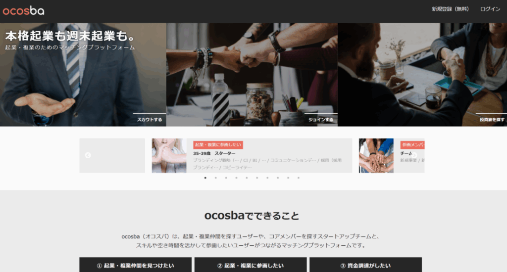 ocosba(オコスバ)は「起業・複業仲間探し」「新事業メンバー探し」「資金調達支援」などを目的としたマッチングプラットフォームです。私なりに整理して特徴・強みを挙げます。もし特定の面(ユーザー、チーム、投資家など)で深く知りたいなら言ってください。