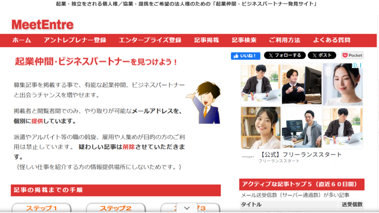 利用者が「起業仲間募集」「ビジネスパートナー募集」などの募集記事を掲載でき、それを閲覧する側とのやりとりが可能。